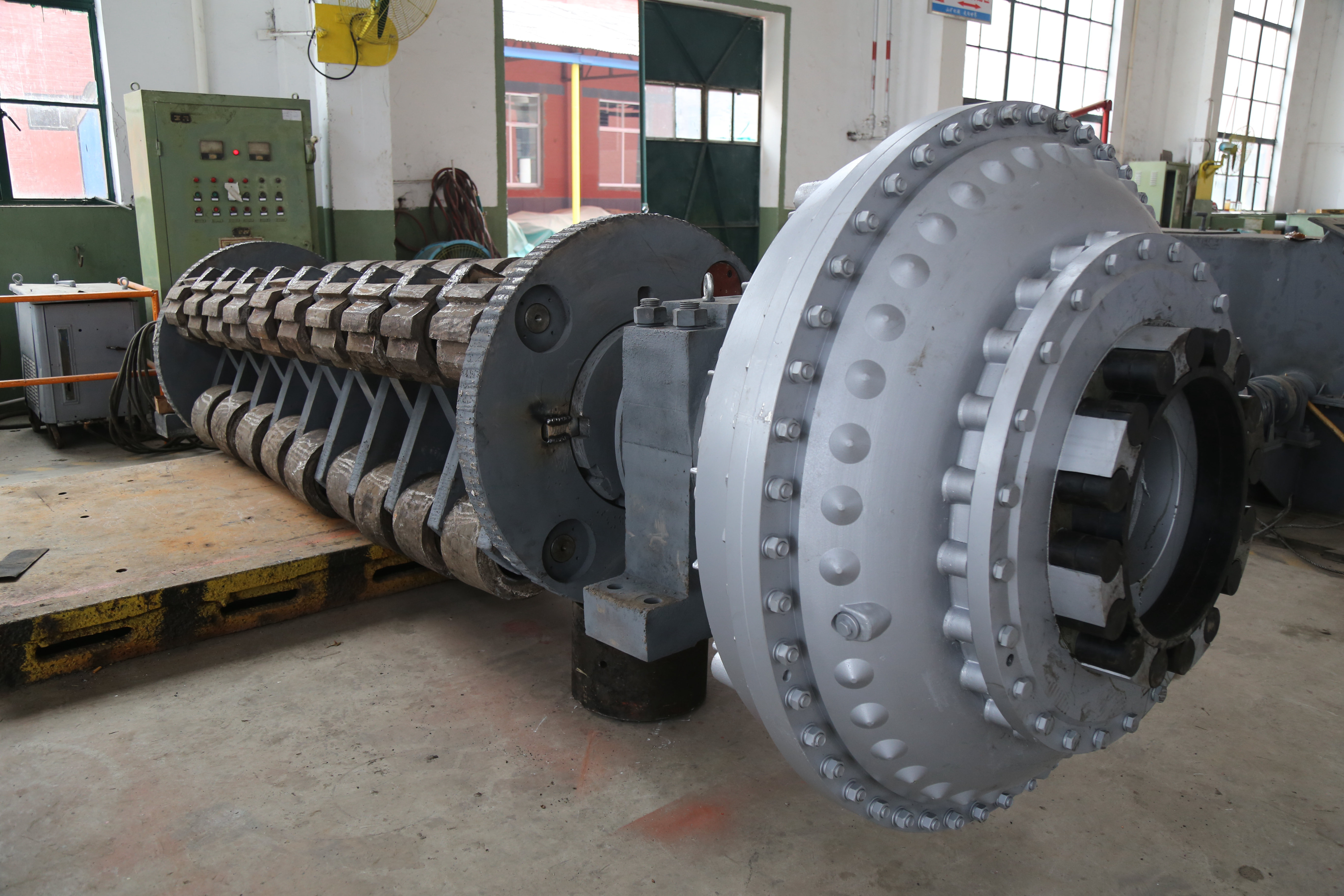 主轴和装配在主轴上的若干平键、圆盘、摇臂、隔套、环锤、环轴等构成转子。转子通过联轴器与电动机轴连接在一起。为增加耐磨性,在圆盘和摇臂外缘焊有硬质合金。