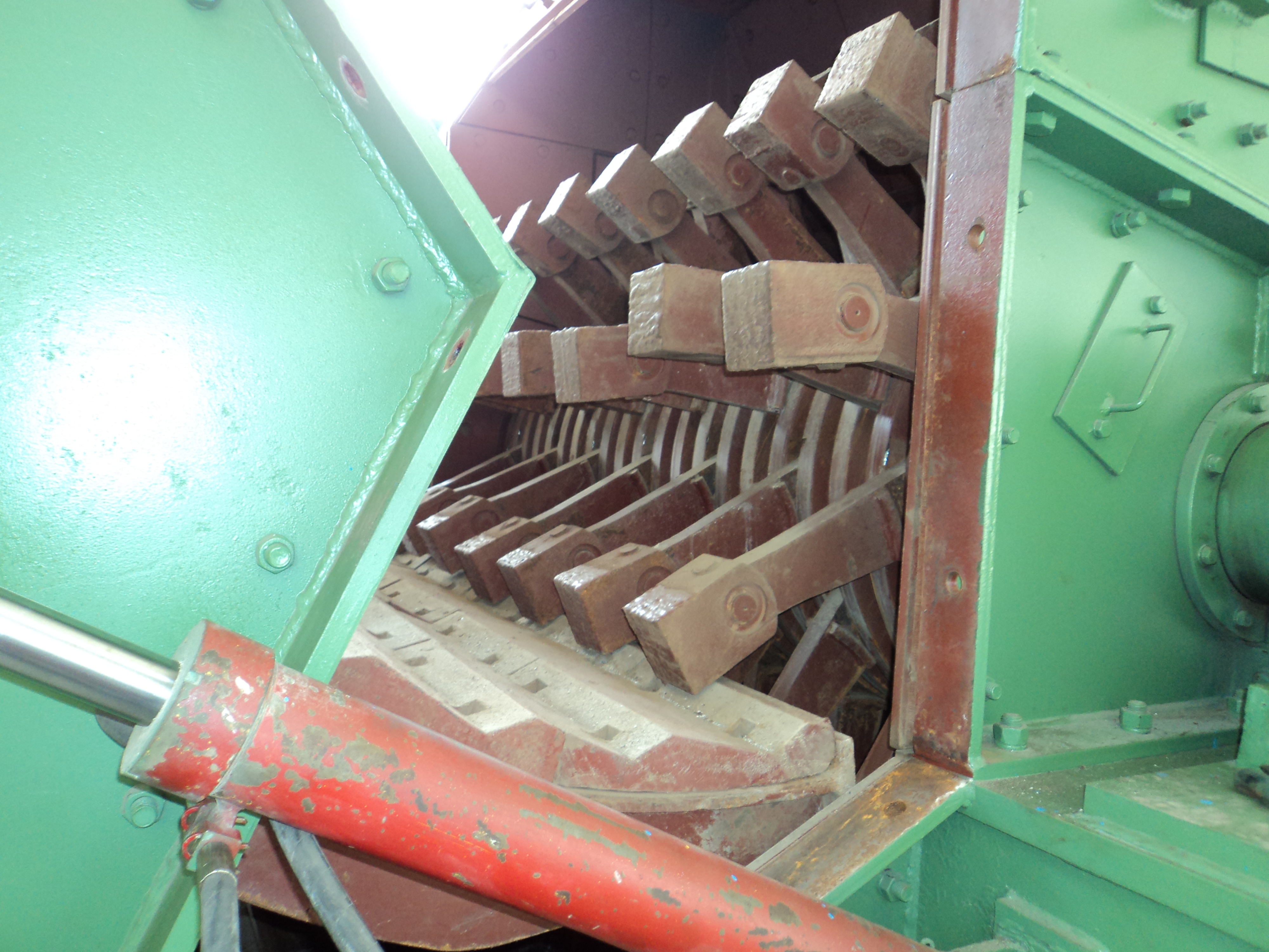 破碎机的结构详见附图。普通型为可逆式旋转的组合锤头,锤杆为优质钢锻制加工,锤头用高耐磨合金制造,反击板和衬板用合金钢制作,耐磨件寿命为6000~10000小时。机壳为双向开启,一般为人工开启,根据用户要求可配备液压开启。机壳打开后,维修和更换易损件极为方便。普通型不配备液压开启装置。本机配有减振平台可供用户选择,加减振平台可降低负荷80%。