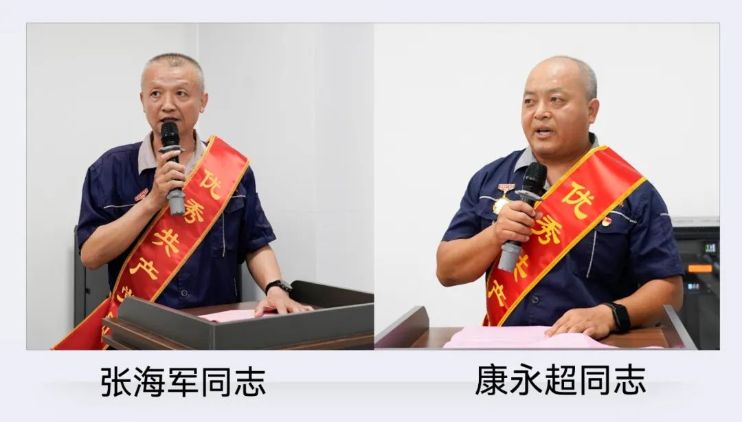 机工装配车间党支部书记张海军同志作为先进基层党组织代表作了表态发言;营销中心党支部康永超同志作为优秀党员代表作了表态发言。