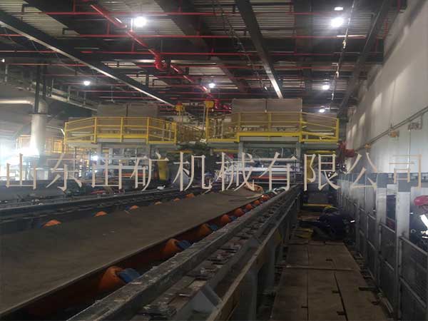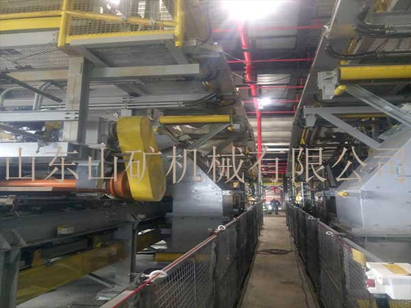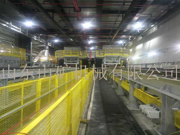 二:卸料车一侧或两侧地面上设有与料仓联通的、平行于卸料车运行轨迹的卸料沟槽,卸料沟槽上覆盖有盖仓皮带,盖仓皮带沿轨道方向呈倒U型轨迹穿过沟槽密封车,盖仓皮带左端固定于轨道左端,右端连接螺旋涨紧装置;盖仓皮带随着卸料车的行走及时掀开及密封,很好的解决了卸料车在行走过程中对卸料车沟槽的密封;