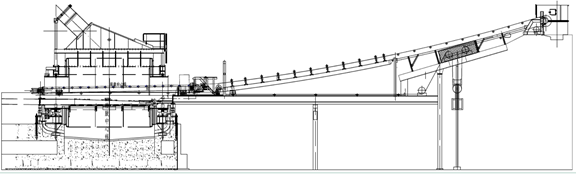 二:折叠式带式输送机(二)为折叠式带式输送机折叠部分,当折叠式带式输送机正常工作时,行走小车进入转鼓内部,接受转鼓落下的水渣,有整条皮带机进行转运;当运行一段时间需要进行维护保养时,行走小车沿轨道开出,进行维修保养。本部分在检修时折叠后给行走小车让出检修空间;