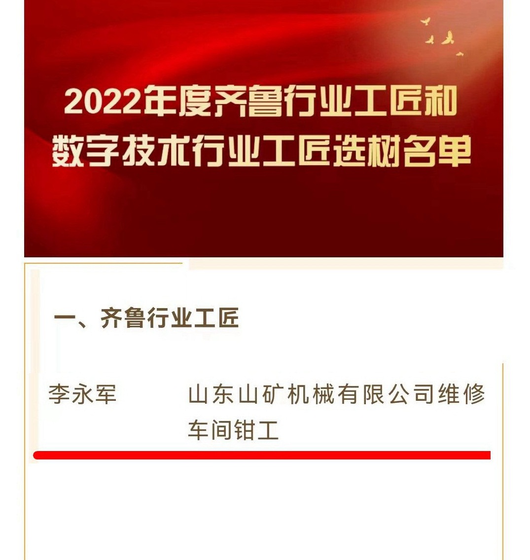 匠心筑梦|热烈祝贺山矿公司职工李永军荣获“2022年度齐鲁行业工匠”称号!