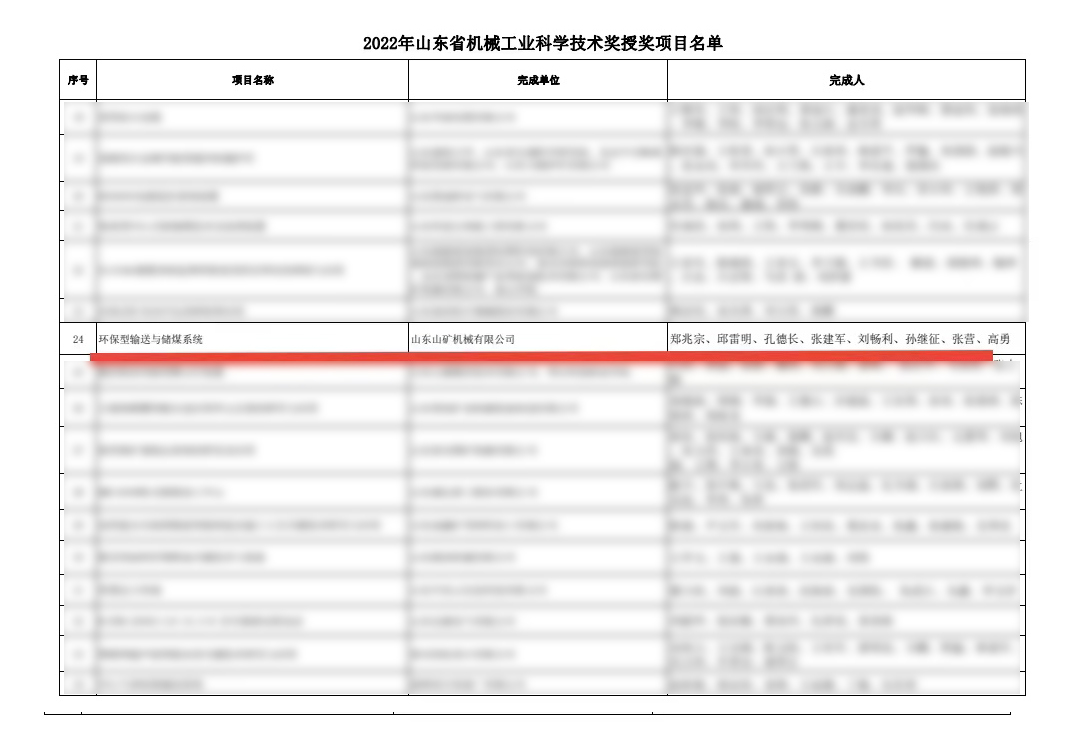 “环保型输送与储煤系统”被山东省机械工业科学技术协会授予“山东省机械工业科学技术奖”。