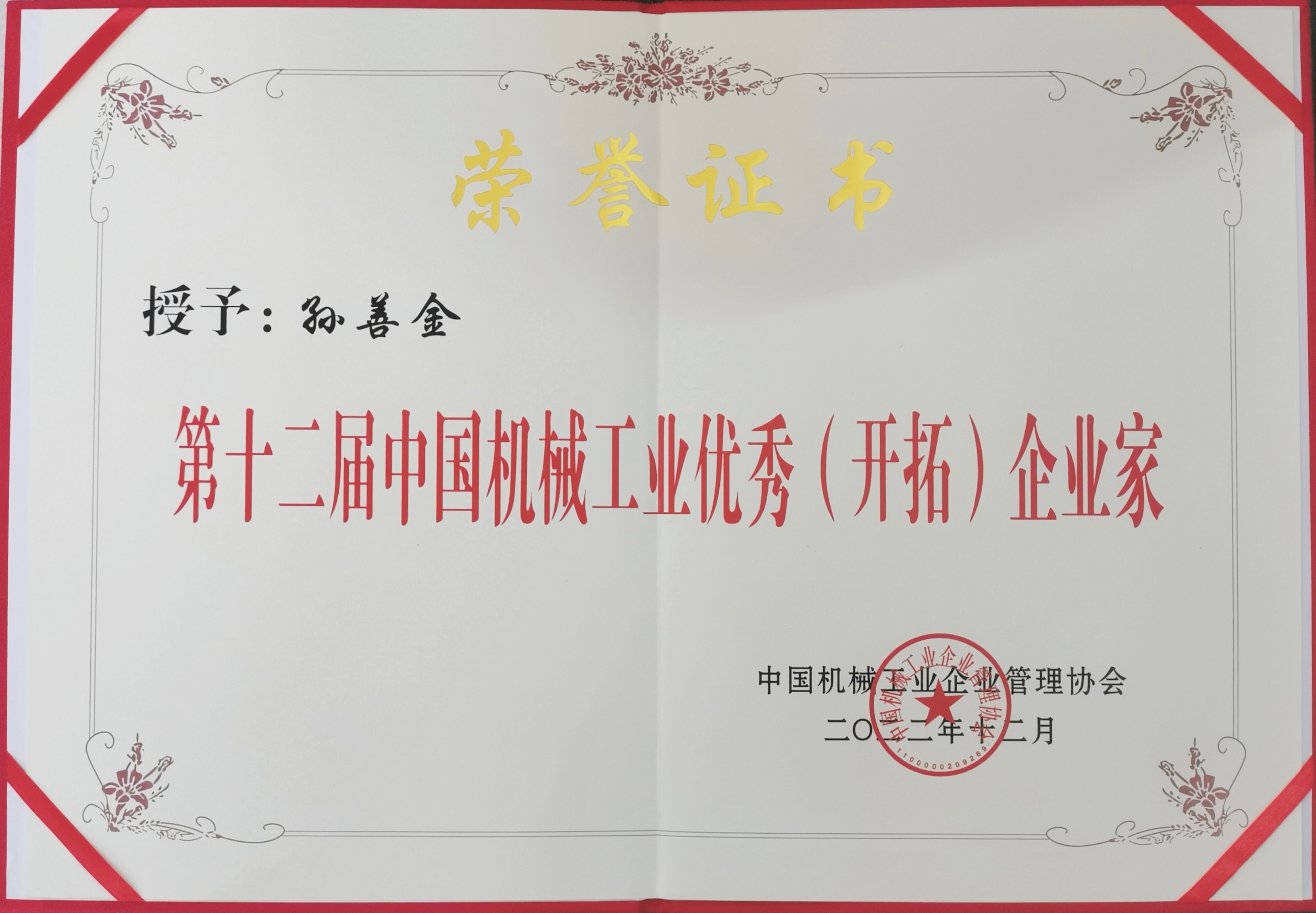 喜报 董事长孙善金荣获“中国机械工业优秀(开拓)企业家”称号
