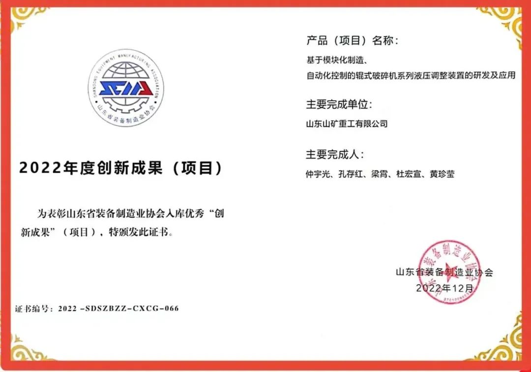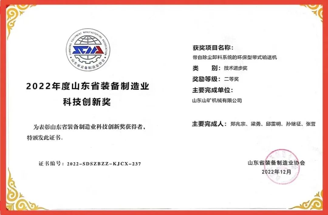 带自除尘卸料系统的环保型带式输送机荣获“2022年度山东省装备制造业科技创新二等奖”;基于模块化制造、自动化控制的辊式破碎机系列液压调整装置的研发及应用成功入选“2022年度创新成果(项目)”。